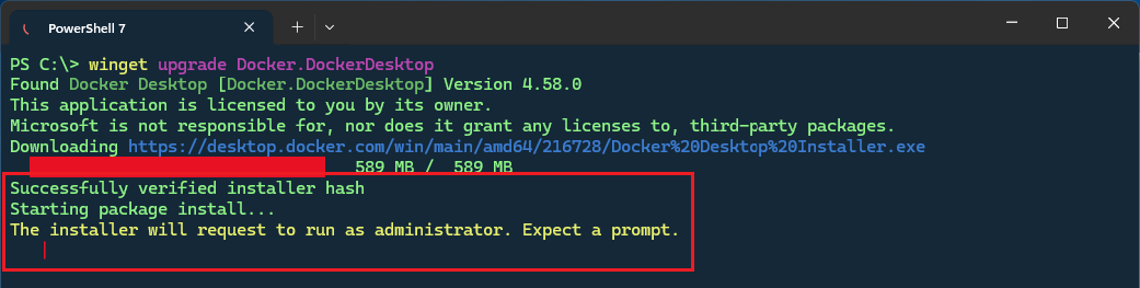 WinGet will automatically begin the upgrade process when the download completes.